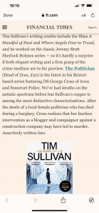 Nice review from Barry Forshaw in the Financial Times. Thrilled to be alongside Michael Connelly, Robert Crais and Steve Cavanagh. So great the books are